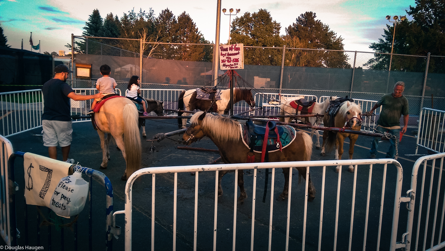 In the park’s parking lot, I came across the pony rides. Six ponies plodded along in a circle so slowly that their hooves barely made the recognizable clip-clopping sound on the asphalt. Four of the saddles remained vacant, and maybe it was just me, but the ponies looked resentful that their time was being utterly wasted. The two kids taking a ride were less than entertained. Maybe children don’t like ponies anymore, maybe $7 is a lot to pay for a few minutes moving in a small circle at under 1mph, or maybe the prospect of riding on the back of a pack animal just pales in comparison to the magic of mechanization offered by the carnival rides. In any case, I decided to go observe the machines.